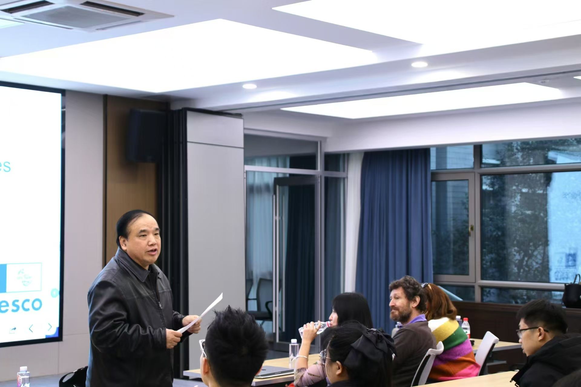 胡院长对Failler教授的到来表示热烈欢迎,并简要介绍其学术经历及成就。袁合研究员简要介绍了蓝色治理中心及联合国教科文组织的工作,鼓励师生积极参与相关研究。报告会上,Failler教授从蓝色经济与治理切入,详述海洋能源的多样性,并以非洲沿海生态系统为例,探讨蓝色经济的核心内涵及其相关产业。他提出海洋生态环境保护与修复是全球发展的战略核心之一,并深入分析全球蓝色治理的机遇与挑战,强调生态安全与全球经济、文化繁荣之间的密切联系。