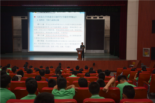 杨院长为新生进行学校文件解读,对学生关心的成绩记载与考核、课程学分的认定和要求、第二专业的辅修规定、学业警示的相关文件要求及补考、重修毕业、转专业等相关内容进行了重点解析,加深了大家对在校学习与生活的理解。此外,杨院长对全体新生提出建议:大学生应走出课堂,了解与吸收多元化大学文化;珍惜大学时光,学会自主学习;做好大学规划,树立远大目标;学会自我调整,尽快适应大学生活。