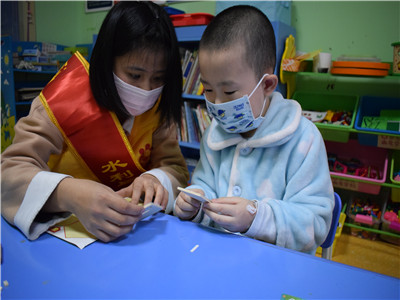 下午三时,志愿者们到达病房学校后开始对教室的桌椅、玩具等进行消毒,有序的摆放桌椅,整理书籍和玩具,以此迎接孩子们的到来。志愿者们带领着到来的孩子们一起进行搭建小木房,拼图等游戏。在带来欢乐的同时也引导孩子们主动思考,增强想象力。随后志愿者们讲解冬至由来和冬至吃饺子的习俗,并对孩子们说吃饺子是因为冬天耳朵冷,而饺子又像耳朵,吃饺子就相当于把耳朵给藏起来这样就不会冻到耳朵了。随着志愿服务接近尾声,孩子们怀着高兴的心情和对晚上冬至吃饺子的期待陆续离去,之后志愿者们打扫整理了房间。