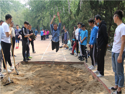 在比赛开始前,吴恩江老师身着学院运动服时而弹跳,时而跨步压腿,自信的脸上没有表现出丝毫压力。短暂的热身结束,比赛正式开始,在裁判的指引下,比赛在激烈且有序地进行着。尽管沙地沙子飞扬,灰尘扑面而来,但教工运动员们也毫不在意,专心跳出更好的成绩。轮到吴老师上场,只见他深呼吸,身体前倾,双手扬起,双腿微躬,在长长地舒一口气后,奋力起跳,在空中划出一道完美的弧线。吴老师的这一跳,双脚尚未完全站稳,看台上便爆发出雷鸣般的掌声,同学们高声喝彩助威,口号声响彻北苑操场上空。在接下来的比赛中,吴恩江老师稳定发挥,获得男子教工老年组跳远比赛的第六名。