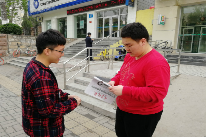 4月14日,威尼斯9499登录入口青年志愿者协会联合齐鲁晚报张刚大篷车开展报纸义卖活动,为威尼斯官网一名在校大学生患肝硬化的父亲募捐善款,学院共有90余人参加活动。