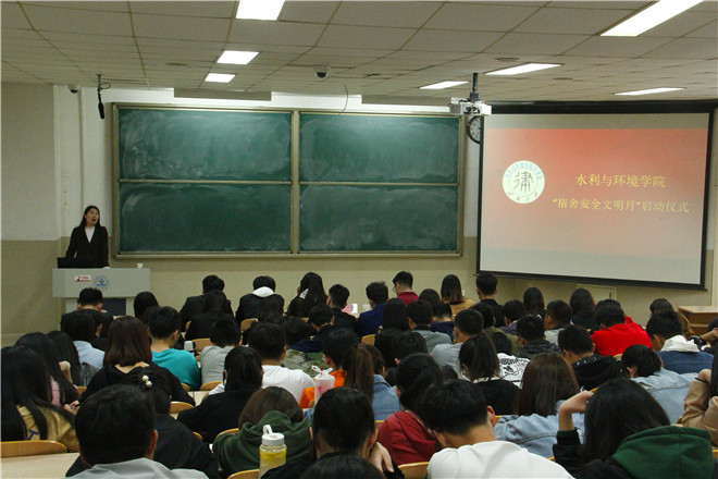 仪式伊始,主持人通过一段视频向同学们展示了学生宿舍在宿舍安全文化方面取得的优秀成果。随后,第八届自律会主席任昱昊简单介绍了宿舍安全文化月活动的举办目的和形式,同时阐明开展此次活动的意义。接下来,第八届自律会宿管中心分管主席杨洁讲解本次宿舍安全文化月具体活动内容。本次活动分为如下四个阶段:一、宿舍安全文明月启动仪式;二、宿舍安全建设;三、文明宿舍评选;四、宿舍文化风采展示暨优秀宿舍表彰。