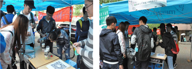 中午,社团准备活动完成后,风采展示活动正式开始。社团成员向大家介绍了社团的相关信息,场上的净水装置吸引了不少同学驻足观赏,有些感兴趣的同学也参与了制作。社团成员对净水装置中存在的不足进行修正,参赛同学制作完成后看到浑浊的水经由净水装置变成清澈的水,露出了开心的笑容,活动现场气氛热烈。