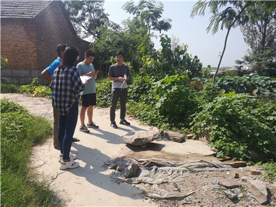 8月18日上午,团队全体成员在金乡县水利局集合完毕接着,团队从水利局了解到调查村落的基本情况。下午,在水利局工作人员的带领下,团队成员先后前往卜集镇的白坨村和张八缸村进行实地考察。来到村委会,成员们从村里的户数、耕地面积、地势高低、河道情况、下雨排水情况、危险区以及水利设施的齐全程度等方面进行详细询问。了解完基本的信息后,团队成员对村子里受降雨影响较大的住户进行仔细地询问,并围绕村子里的小沟、暗渠、排水系统进行逐一考察拍摄并纪录。
