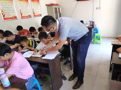 在讲课前20分钟的早操时间,当地学生在支教团队员的带领下一起做广播体操,经过多次的练习,学生们做操的姿势逐渐规范,太阳的曙光透过屋檐照亮了孩子们天真烂漫的脸庞,洋溢着青春的气息和对美好未来的憧憬。第一堂经典诵读课正式开始,当地学生在支教团队员的带领下学习诗歌朗诵、用手语的形式学唱歌曲《感恩的心》,课堂上同学们热情高涨,积极发言,支教团队员们奖励文具或者贴纸给表现优秀的同学。在课间,队员们主动去跟当地学生聊天,并进行互动和游戏。随后,支教团队员又分别进行了数学和书法练习的授课,他们对书法练习规范的学生提出表扬,并把他们的书法练习粘贴到教室门口展示。