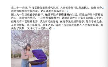活动开始前,活动组织者通过QQ、微信、微博等平台进行了活动宣传,动员同学们积极参与本次活动。活动开始后,同学们积极参与,撰写“抗疫中的雷锋精神”“雷锋精神传承”等诸多优秀作品,充分展现了雷锋精神的内涵和传承。