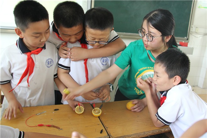 活动伊始,志愿者们用古希腊直至近现代的故事,为小朋友们介绍从发现物体的吸引,对雷电认识和实验以及构建电的理论的过程,让小朋友们对人类探索电的历程有全面的了解。随后志愿者结合图片,从最早的伏打电堆发展到二次电池,一直到今天使用的碱性电池和氢氧燃料电池,介绍电池的历史。接下来志愿者介绍电力设备,小朋友们了解到,电力设备分为发电机和电动机,分别经历了数十年的演变与发展。在活动的最后一个环节中,志愿者带领小朋友们制作水果电池,并详细讲解其中的原理,让小朋友们对电的传导有直观的了解,增加课堂的趣味性。最后志愿者阐明电对人类生产生活的重要性,呼吁小朋友节约用电。一个小朋友说:“今天才知道原来我们身边天天都要用的电,是这么多科学家辛苦研究出来的,真不容易。”