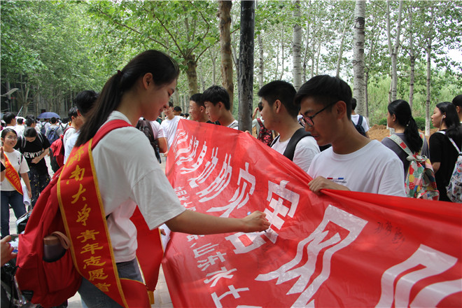 上午十二时许,志愿者们来到第八食堂广场进行简单的布置后,开始向来往的同学们讲解关于地震等自然灾害的知识。志愿者们用现实生活中发生的案例向同学们强调自然灾害的危险性,呼吁大家要重视学习防震减灾的知识,树立防震减灾的意识,在面对自然灾害时,要保持冷静的头脑,采取正确的避灾措施,把自身受到的伤害降到最低。志愿者们声情并茂的讲解很快引来了众多同学们驻足倾听,志愿者们借机向在场的同学们分发有关自然灾害的传单,并开始向同学们宣传当自然灾害发生时紧急避险的措施,志愿者们精彩的讲解得到了同学们热烈的掌声。最后,志愿者们邀请在场的同学们在条幅上签上自己的名字,本次防震减灾主题活动在志愿者们的合影中画下了圆满的句号。